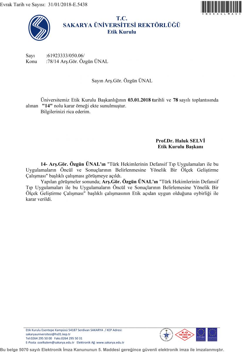 Arş.Gör.Özgün ÜNAL'ın "Türk Hekimlerinin Defansif Tıp Uygulamaları ile Bu Uygulamaların Öncül ve Sonuçlarının Belirlenmesine Yönelik Bir Ölçek Geliştirme Çalışması" isimli Online Anket