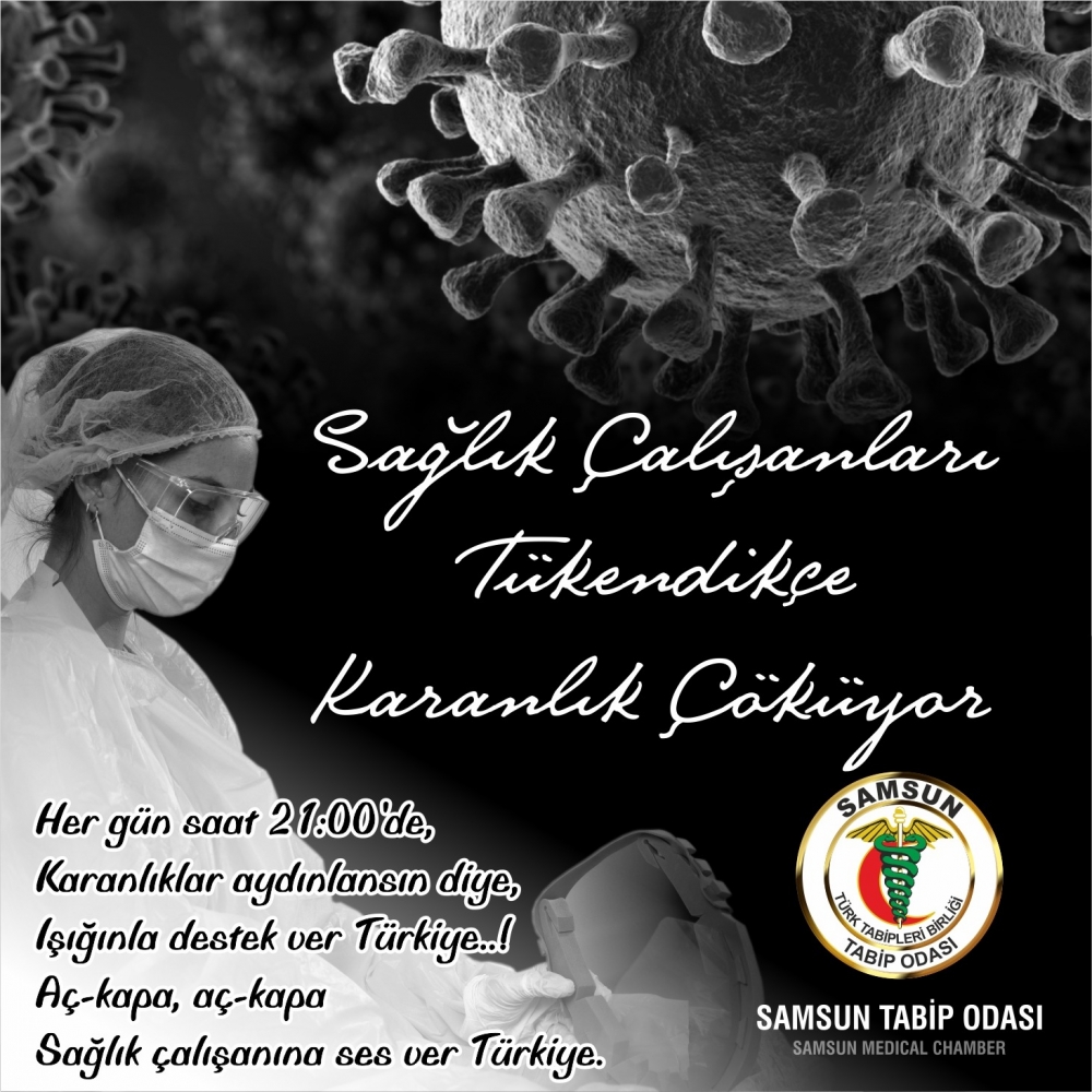 Sağlık çalışanları tükendikçe karanlık çöküyor. Bunun için bize ışık olun. Bir hafta boyunca her akşam saat 21.00 da ışıklarınızı açıp kapatarak Covid 19’un meslek hastalığı sayılması için mücadelemize destek verin. Tüm halkımıza davetimizdir…