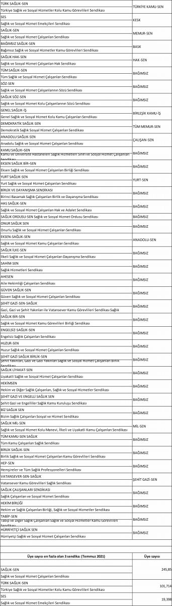 Sağlık ve sosyal hizmetler hizmet kolunda kurulmuş bulunan 41 adet kamu görevlileri sendikası var, bu sendikalardan 12’si konfederasyonlardan birine üye, 29’u bağımsız sendikadır. 4688 sayılı yasaya göre meslek veya işyeri esasına göre sendika kurulamaz. Sendikanın adı bu şekilde olduğu izlenimi verse bile; sadece hekimlerin, sadece aile hekimlerinin, sadece cerrahların, sadece hemşirelerin, sadece yoğun bakım hemşirelerinin, sadece ebelerin üye olduğu bir sendika kurulamayacağı gibi sadece bir işyerinde, sadece bir ilde veya bölgede çalışanların üye olacağı sendika kurulamaz.