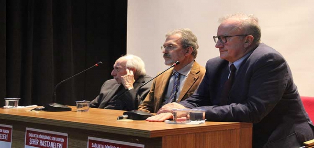 Prof. Dr. Selçuk Erez yaptığı konuşmada “Şehir Hastaneleri projesini ‘Dünyanın en büyükleri arasına giriyoruz’ diyerek lanse ediyorlar. Örneğin İkitelli Şehir Hastaneleri projesini ‘2700 yatak kapasiteli olacak, günde 23600 hastaya hizmet edecek, 1 milyon metrekarenin üzerinde inşaat alanına sahip, dünyanın en büyük hastaneleri arasında yer alacak’ argümanlarıyla tanıtıyorlar. Oysa dünyada kabul görmüş kıstaslara göre 200’den az, 600’den çok yatak kapasiteli hastanelerin verimli çalışması mümkün değil. Projeler büyüklükleri, inşaat alanları, yatak sayılarıyla değil, verilecek sağlık hizmetinin niteliği ile ölçülmelidir” dedi ve Şehir Hastaneleri projesinin tıpkı AVM inşa edercesine, konut projesi yaparcasına aynı rant sağlama mantığıyla hayata geçirilmeye çalışıldığına dikkat çekti. Dr. Erez yapılan devasa şehir hastanelerinin bir süre sonra işleyemez hale geleceğini ve tüm yükün kamuya yükleneceğini söyledi.