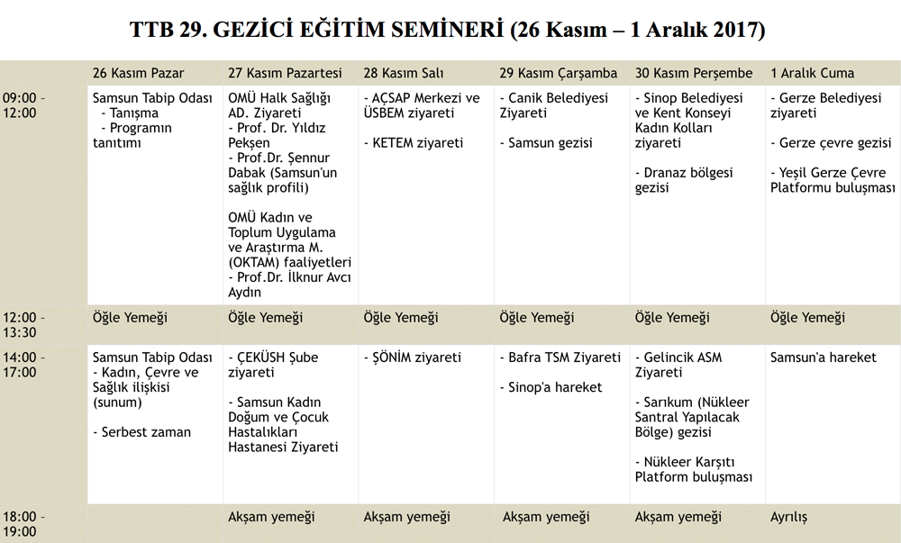 26 Kasım- 1 Aralık tarihleri arasında altı gün sürecek olan, farklı üniversitelerden 26 halk sağlığı asistanı hekim meslektaşımızın ve iki öğretim görevlisinin katılacağı Gezici Eğitim Seminerinde bu senenin teması “Kadın Sağlığı” olacak. Eğitime katılan hekimler Samsun ve Sinop ilindeki Kadın sağlığı konusundaki çalışmaları farklı birimleri ziyaret etmek suretiyle 6 gün boyunca yerinde gözlemleyecekler.