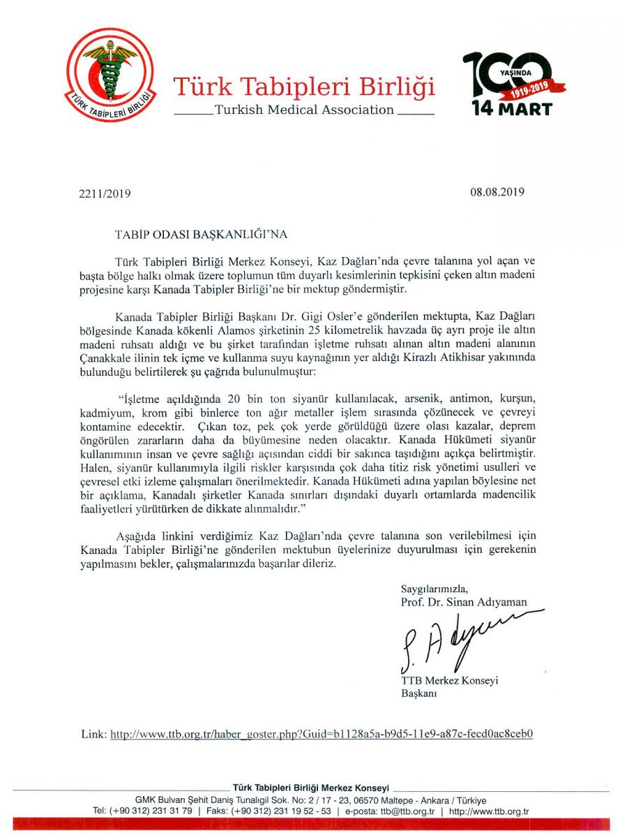 Kanada Tabipler Birliği Başkanı Dr. Gigi Osler’e 08 Ağustos 2019 tarihinde gönderilen mektupta, Kaz Dağları bölgesinde Kanada kökenli Alamos şirketinin 25 kilometrelik havzada üç ayrı proje ile altın madeni ruhsatı aldığı ve bu şirket tarafından işletme ruhsatı alınan altın madeni alanının Çanakkale ilinin tek içme ve kullanma suyu kaynağının yer aldığı Kirazlı Atikhisar yakınında bulunduğu belirtilerek şu çağrıda bulunmuştur.